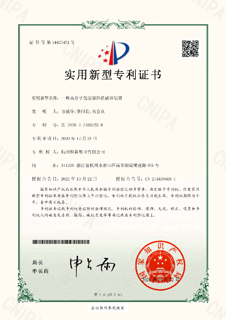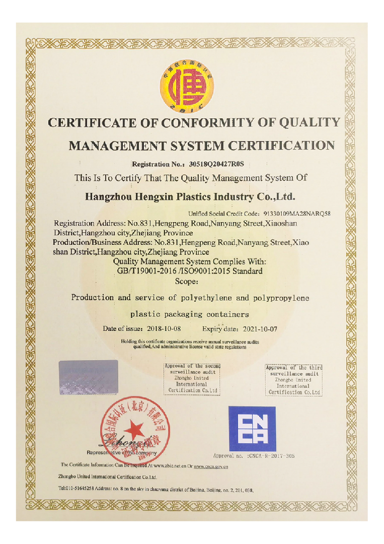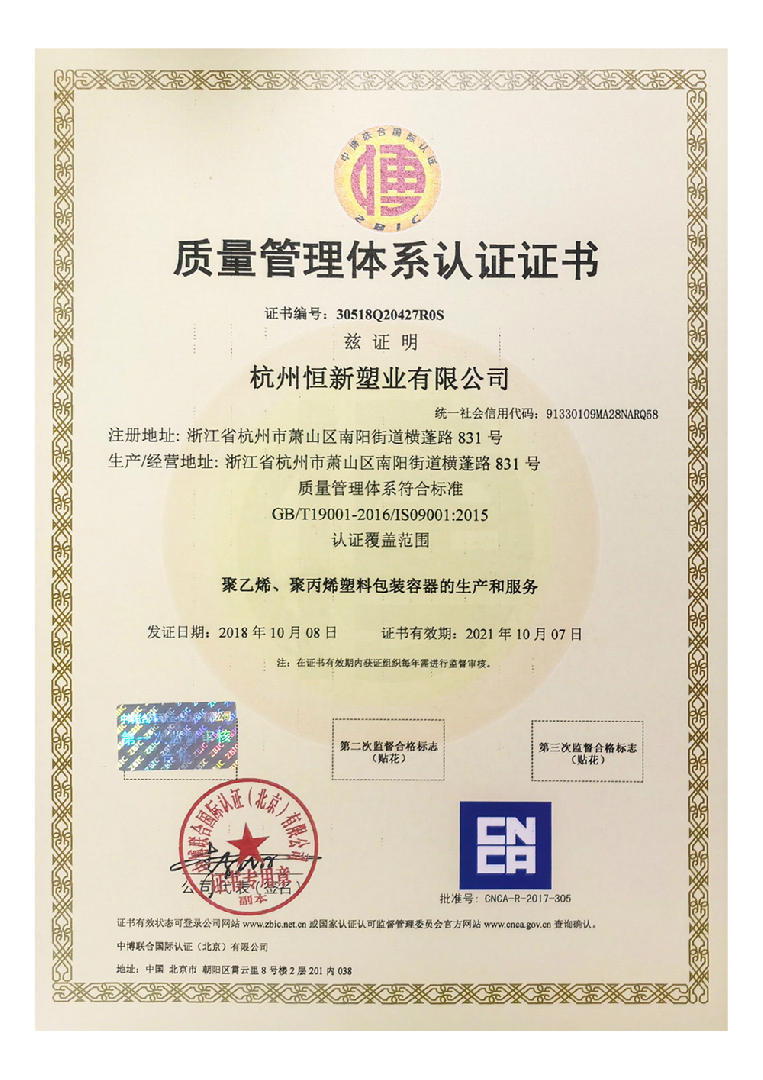 杭州恒新塑業(yè)有限公司位于美麗的西子湖畔杭州空港經(jīng)濟(jì)區(qū),公司占地面積10000多平方米,距杭州蕭山國際機(jī)場2公里,地理位置優(yōu)越,交通便捷。公司擁有先進(jìn)的生產(chǎn)設(shè)備,一流的技術(shù)人員和一整套完善的生產(chǎn)工藝管理體系標(biāo)準(zhǔn),從事企業(yè)的各項管理工作。專業(yè)生產(chǎn)PE(聚乙烯)、COEX(多層高阻隔)和PET (聚酯)等系列塑料制品,規(guī)格從10毫升到25升不等。公司現(xiàn)有產(chǎn)品100多種,廣泛使用于農(nóng)藥、化工醫(yī)藥、食品、五金電子、機(jī)電等領(lǐng)域。同時,可根據(jù)客戶的不同需求 ,經(jīng)專業(yè)化的“量身定制”,提供性價比更佳的產(chǎn)品和服務(wù)。